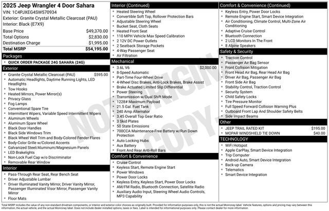Check Out All These options Quick Order Package 24G Sahara, 110 MPH Vehicle Max Speed Calibration, 3.45 Overall Top Gear Ratio, 4-Wheel Disc Brakes, 4G LTE Wi-Fi Hot Spot, 8 Speakers, ABS brakes, Air Conditioning, Alloy wheels, AM/FM radio: SiriusXM, Apple CarPlay, Apple CarPlay/Android Auto, Automatic temperature control, Aux Battery, Brake assist, Cloth Low-Back Bucket Seats, Compass, Connectivity - US/Canada, Delay-off headlights, Driver door bin, Driver vanity mirror, Dual front impact airbags, Dual front side impact airbags, Electronic Stability Control, Emergency communication system: Jeep Connect, Front anti-roll bar, Front Bucket Seats, Front Center Armrest w/Storage, Front dual zone A/C, Front fog lights, Front reading lights, Fully automatic headlights, Google Android Auto, Heated door mirrors, Heated front seats, Heated steering wheel, Heavy Duty Suspension w/Gas Shocks, Illuminated entry, Integrated Center Stack Radio, Integrated roll-over protection, Jeep Trail Rated Kit, Low tire pressure warning, MOPAR Windshield Tie Down, Non-Lock Fuel Cap w/o Discriminator, Occupant sensing airbag, Outside temperature display, Overhead airbag, Panic alarm, ParkView Rear Back-Up Camera, Passenger door bin, Passenger vanity mirror, Power door mirrors, Power steering, Power windows, Radio data system, Radio: Uconnect 5 w/12.3 Display, Rear anti-roll bar, Rear reading lights, Remote keyless entry, Security system, Speed control, Split folding rear seat, Steering wheel mounted audio controls, Stop-Start Dual Battery System, Tachometer, Telescoping steering wheel, Tilt steering wheel, Traction control, Trip computer, Variably intermittent wipers, Voltmeter, and Wheels: 18 x 7.5 Machine/Painted Gray. Price includes: $1500 - 2025 National Bonus Cash . Exp. 02/02/2026 $2000 - 2025 National Select Inventory Bonus Cash w/ 3FV . Exp. 02/02/2026 $2500 - 2025 National Retail Bonus Cash . Exp. 02/02/2026