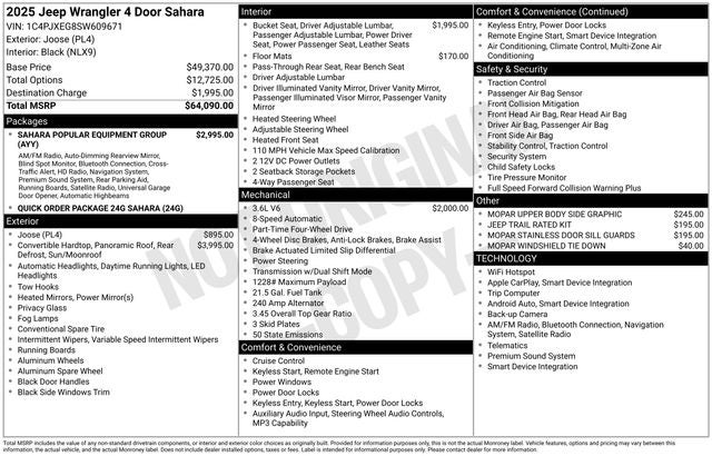 Check Out All These options Quick Order Package 24G Sahara, Sahara Popular Equipment Group (#1 Seat Foam Cushion, 12.3 Touchscreen Display, 4G LTE Wi-Fi Hot Spot, Alpine Premium Audio System, Apple CarPlay, Auto High Beam Headlamp Control, Auto-Dimming Rear-View Mirror, Blind Spot & Cross Path Detection, Connected Travel & Traffic Services, Connectivity - US/Canada, Disassociated Touchscreen Display, For More Info, Call 800-643-2112, Google Android Auto, GPS Navigation, Hard Seat Back, HD Radio, Integrated Center Stack Radio, Integrated Off-Road Camera, Integrated Voice Command w/Bluetooth®, Leather Wrapped Park Brake Handle, Leather Wrapped Shift Knob, McKinley Trimmed Seats, ParkSense Rear Park Assist System, Power 4-Way Driver Lumbar Adjust, Power 4-Way Passenger Lumbar Adjust, Power Adjust 8-Way Driver Seat, Power Adjust 8-Way Front Passenger Seat, Radio: Uconnect 5 Nav w/12.3 Display, Side Steps, SiriusXM Radio Service, SiriusXM w/360L, and Universal Garage Door Opener), 110 MPH Vehicle Max Speed Calibration, 3.45 Overall Top Gear Ratio, 4-Wheel Disc Brakes, 8 Speakers, ABS brakes, Air Conditioning, Alloy wheels, AM/FM radio: SiriusXM, Apple CarPlay/Android Auto, Automatic temperature control, Aux Battery, Brake assist, Cloth Low-Back Bucket Seats, Compass, Delay-off headlights, Driver door bin, Driver vanity mirror, Dual front impact airbags, Dual front side impact airbags, Electronic Stability Control, Emergency communication system: Jeep Connect, Front anti-roll bar, Front Bucket Seats, Front Center Armrest w/Storage, Front dual zone A/C, Front fog lights, Front reading lights, Fully automatic headlights, Heated door mirrors, Heated front seats, Heated steering wheel, Heavy Duty Suspension w/Gas Shocks, Illuminated entry, Integrated roll-over protection, Jeep Trail Rated Kit, Low tire pressure warning, MOPAR All-Weather Floor Mats, MOPAR Stainless Door Sill Guards, MOPAR Upper Body Side Graphic, MOPAR Windshield Tie Down, Non-Lock Fuel Cap w/o Discriminator, Occupant sensing airbag, Outside temperature display, Overhead airbag, Panic alarm, ParkView Rear Back-Up Camera, Passenger door bin, Passenger vanity mirror, Power door mirrors, Power steering, Power Top Quarter Window Storage Bag, Power windows, Radio data system, Radio: Uconnect 5 w/12.3 Display, Rear anti-roll bar, Rear reading lights, Rear Window Defroster, Rear Window Wiper/Washer, Remote keyless entry, Removable Rear Quarter Windows, Security system, Sky 1-Touch Power Top, Speed control, Split folding rear seat, Steering wheel mounted audio controls, Stop-Start Dual Battery System, Tachometer, Telescoping steering wheel, Tilt steering wheel, Traction control, Trip computer, Variably intermittent wipers, Voltmeter, and Wheels: 18 x 7.5 Machine/Painted Gray. Price includes: $1500 - 2025 National Bonus Cash . Exp. 02/02/2026 $2000 - 2025 National Select Inventory Bonus Cash w/ 3FV . Exp. 02/02/2026 $2500 - 2025 National Retail Bonus Cash . Exp. 02/02/2026 $500 - 2025 National Select Inventory Bonus Cash. Exp. 01/04/2027