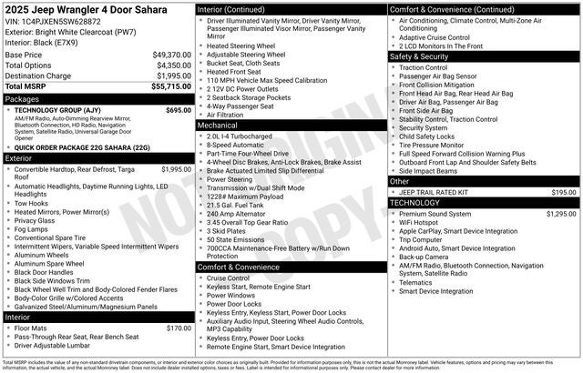 Check Out All These options Quick Order Package 22G Sahara, Technology Group (12.3 Touchscreen Display, 4G LTE Wi-Fi Hot Spot, Apple CarPlay, Auto-Dimming Rear-View Mirror, Connected Travel & Traffic Services, Connectivity - US/Canada, Google Android Auto, GPS Navigation, HD Radio, Integrated Off-Road Camera, Integrated Voice Command w/Bluetooth®, Radio: Uconnect 5 Nav w/12.3 Display, SiriusXM Radio Service, SiriusXM w/360L, and Universal Garage Door Opener), 110 MPH Vehicle Max Speed Calibration, 3.45 Overall Top Gear Ratio, 4-Wheel Disc Brakes, 8 Speakers, ABS brakes, Air Conditioning, Alloy wheels, Alpine Premium Audio System, AM/FM radio: SiriusXM, Apple CarPlay/Android Auto, Automatic temperature control, Aux Battery, Body Color 3-Piece Hard Top, Brake assist, Cloth Low-Back Bucket Seats, Compass, Delay-off headlights, Driver door bin, Driver vanity mirror, Dual front impact airbags, Dual front side impact airbags, Electronic Stability Control, Emergency communication system: Jeep Connect, Freedom Panel Storage Bag, Front anti-roll bar, Front Bucket Seats, Front Center Armrest w/Storage, Front dual zone A/C, Front fog lights, Front reading lights, Fully automatic headlights, Heated door mirrors, Heated front seats, Heated steering wheel, Heavy Duty Suspension w/Gas Shocks, Illuminated entry, Integrated Center Stack Radio, Integrated roll-over protection, Jeep Trail Rated Kit, Low tire pressure warning, MOPAR All-Weather Floor Mats, Non-Lock Fuel Cap w/o Discriminator, Occupant sensing airbag, Outside temperature display, Overhead airbag, Panic alarm, ParkView Rear Back-Up Camera, Passenger door bin, Passenger vanity mirror, Power door mirrors, Power steering, Power windows, Radio data system, Radio: Uconnect 5 w/12.3 Display, Rear anti-roll bar, Rear reading lights, Rear Window Defroster, Rear Window Wiper/Washer, Remote keyless entry, Security system, Speed control, Split folding rear seat, Steering wheel mounted audio controls, Stop-Start Dual Battery System, Tachometer, Telescoping steering wheel, Tilt steering wheel, Traction control, Trip computer, Variably intermittent wipers, Voltmeter, and Wheels: 18 x 7.5 Machine/Painted Gray. Price includes: $1500 - 2025 National Bonus Cash . Exp. 02/02/2026 $2500 - 2025 National Retail Bonus Cash . Exp. 02/02/2026