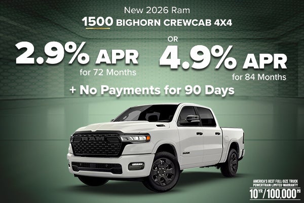 *Ex: New 2026 Ram 1500 Big Horn Crew Cab 4x4. VIN: 3C6SRFFP0T4160653. MSRP $62,785. 2.9% APR financing for 72 months. $13.89 per month per every $1,000 borrowed. 4.9% APR financing for 84 months. $13.87 per month per every $1,000 borrowed. No payments for 90 days. Interest accrues from the date of purchase. With approved credit through Stellantis Financial Services. Not all will qualify. On select models. If provided, Advertised Price EXCLUDES all optional dealer offered items, accessories, or product addendums optionally selected by the purchaser, dealer document processing fee of $797 per TCA 55-17-114, and state and local taxes, tags, registration and title fees. Advertised prices INCLUDE factory-installed options installed by the manufacturer and non-optional dealer-installed accessories already installed on the vehicle by the dealer at time of advertising. See dealer for details. Offer Expires 04/30/2026.