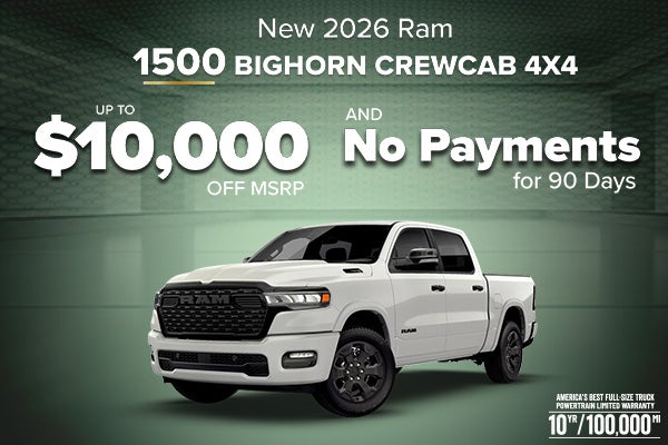 *Ex: New 2026 Ram 1500 Big Horn Crew Cab 4x4. VIN: 3C6SRFFP0T4160653. MSRP $62,785. Up to $10,000 off MSRP available on select 2026 models in dealer inventory. No payments for 90 days. Interest accrues from the date of purchase. With approved credit through Stellantis Financial Services. Not all will qualify. On select models. If provided, Advertised Price EXCLUDES all optional dealer offered items, accessories, or product addendums optionally selected by the purchaser, dealer document processing fee of $797 per TCA 55-17-114, and state and local taxes, tags, registration and title fees. Advertised prices INCLUDE factory-installed options installed by the manufacturer and non-optional dealer-installed accessories already installed on the vehicle by the dealer at time of advertising. See dealer for details. Offer Expires 04/30/2026.